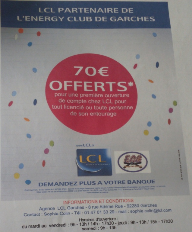 Energy Club de Garches a établi un partenariat fort avec la banque LCL. Pour une première ouverture de compte chez LCL par tout licencié du Club ou toute personne de son entourage, 70 € lui seront offerts et 70 € seront offerts au club !